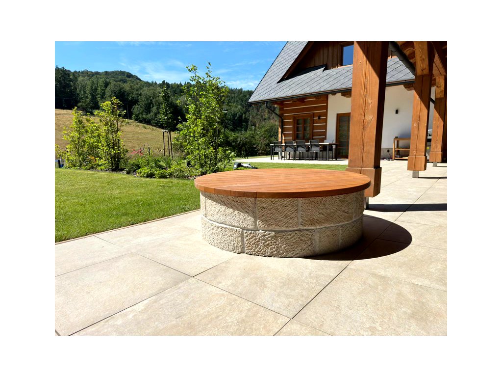 Vzali jsme náš obklad Rustik, mírně jej zahli a vznikl obklad na studny. Dobře, bylo to trochu složitější, ale důležitý je výsledek. Studna se prodává jako kompletní set. Jediná práce, která zbyla na vás, je odejmout z vaší studny stávající betonovou skruž a usadit místo ní tento komplet.